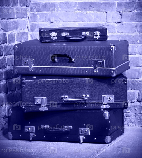 Старые винтажные чемоданы, изолированные возле кирпичной стены