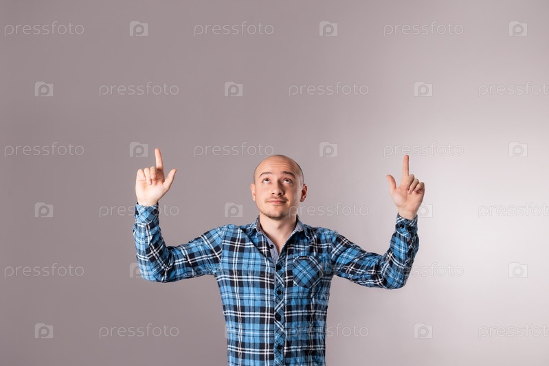 Мужчина указывает пальцами в повседневную одежду man pointing fingers up casual wear