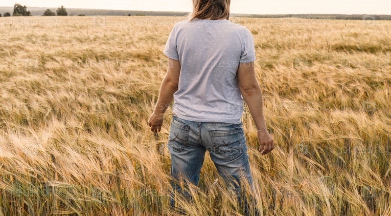 Вид сзади женщина в джинсах среди желтых сухих злаков пшеничное поле сельское хозяйство и урожай зерна макет дружелюбный