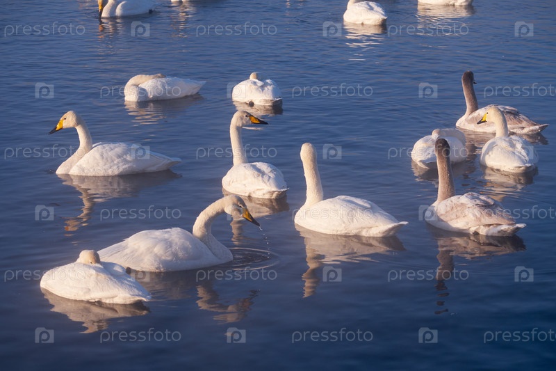 Лебеди и утки в тумане на алтайском озере Светлое