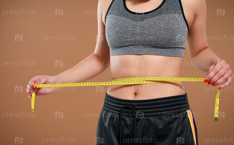 Крупный план стройной женщины, измеряющей размер своей талии рулеткой. Изолированные на желтом фоне