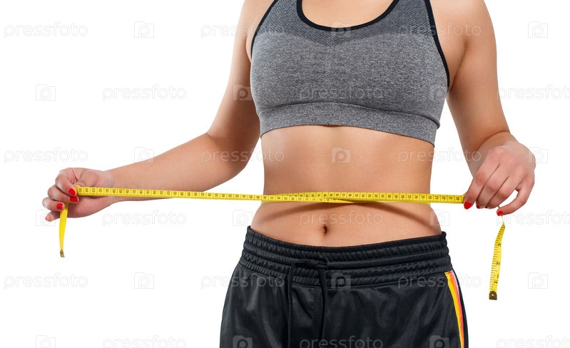 Стройная женщина измеряет размер своей талии рулеткой на белом