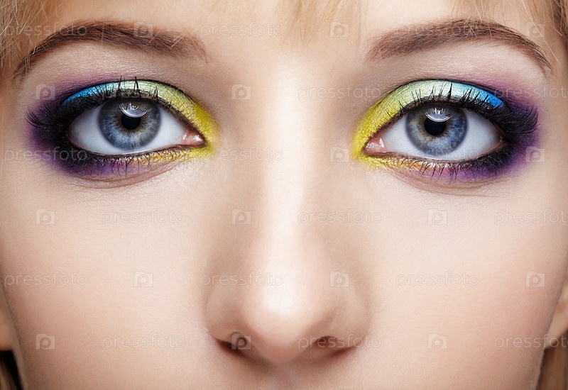 Макроизображение крупным планом человеческого женского глаза с фиолетовым, синим и желтым макияжем