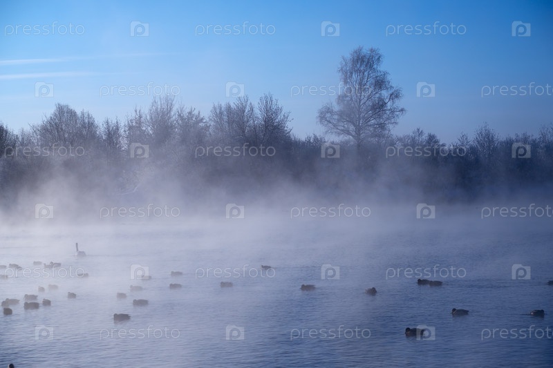 Лебеди и утки в тумане на алтайском озере Светлое