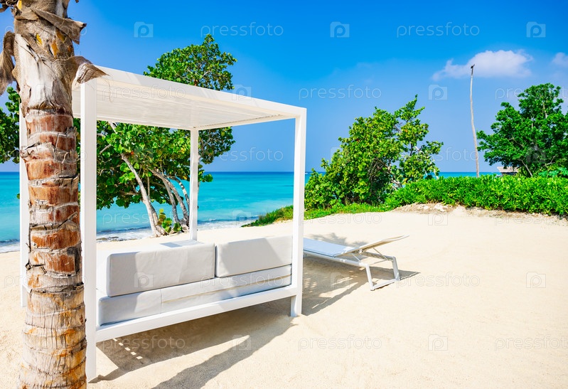 Белая кровать на песчаном пляже моря