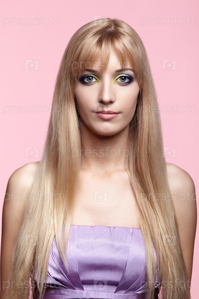 Молодая женщина с длинными светлыми волосами на розовом фоне