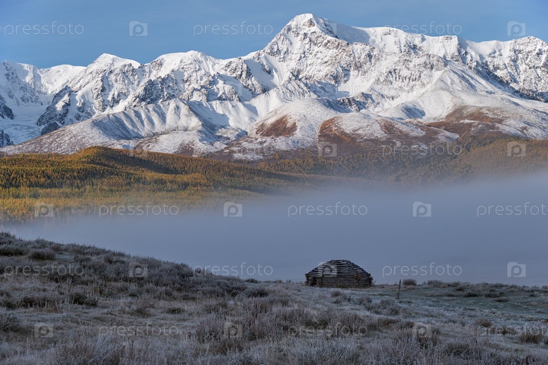 Дом пастуха на алтайском озере Джангыскол на горном плато Эштыкель. Утренний туман над водой. Алтай, Россия
