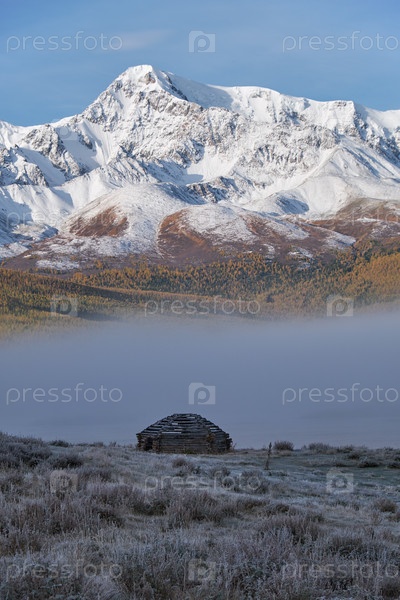 Дом пастуха на алтайском озере Джангыскол на горном плато Эштыкель. Утренний туман над водой. Алтай, Россия