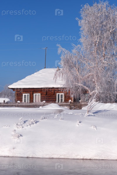 Алтайское русское село Талица под зимним снегом на берегу реки