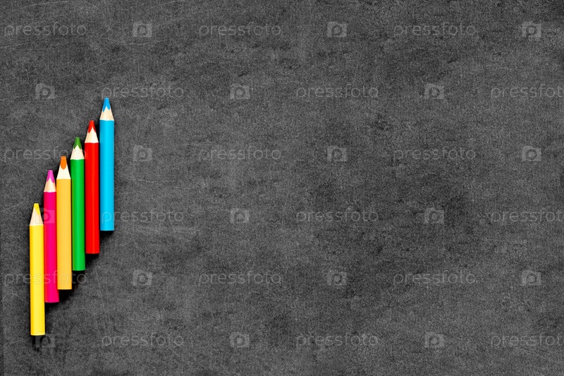 Цветные карандаши выложены на школьной черной доске, макет