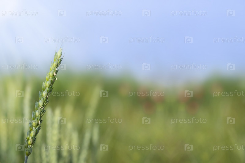 Незрелый одиночный зеленый колос пшеницы, зерновые культуры созревают в поле, солнечные лучи, пространство для копирования