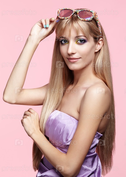 Молодая блондинка улыбается женщина в веселых конфетных очках на розовом фоне