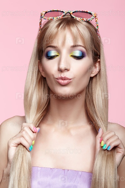 Молодая блондинка в веселых конфетных очках на розовом фоне