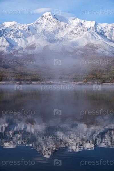 Алтайское озеро Джангыскол на горном плато Эштыкель. Утренний туман над водой. Алтай, Сибирь, Россия