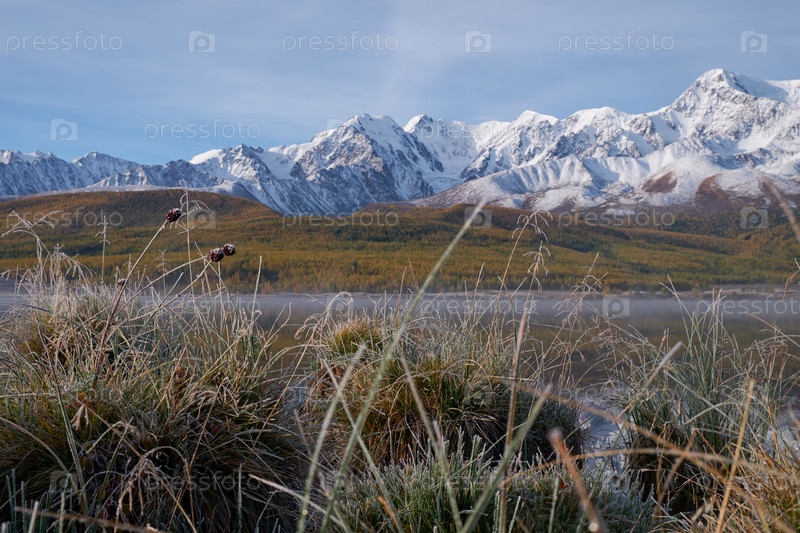 Алтайское озеро Джангыскол на горном плато Эштыкель. Утренний туман над водой. Алтай, Сибирь, Россия