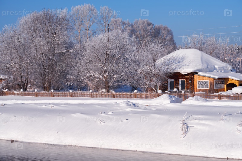 Алтайское русское село Талица под зимним снегом на берегу реки