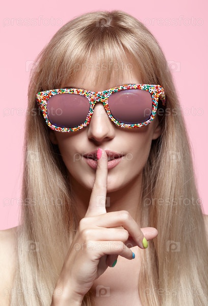 Молодая блондинка в веселых конфетных очках и пальцем на губах на розовом фоне