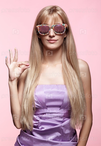 Молодая блондинка улыбается женщина в веселых конфетных очках на розовом фоне
