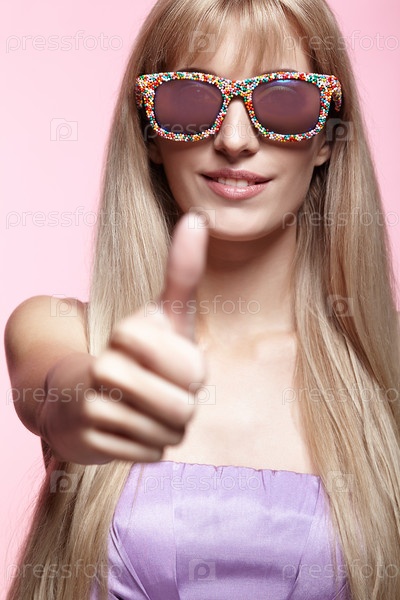 Молодая блондинка улыбается женщина в забавных конфетных очках и большой палец вверх на розовом фоне