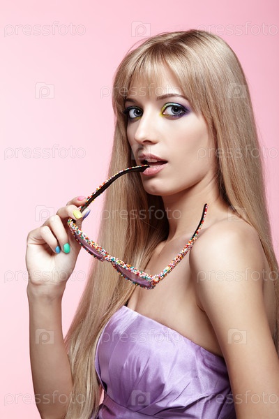 Молодая блондинка в веселых конфетных очках на розовом фоне