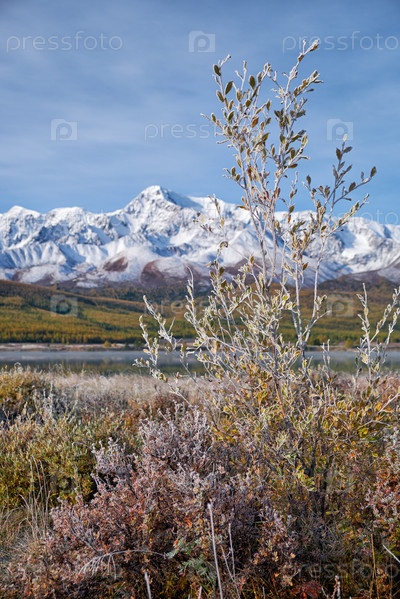 Замороженные листья ивы под инеем. На заднем плане - снежные горы Северо-Чуйского хребта