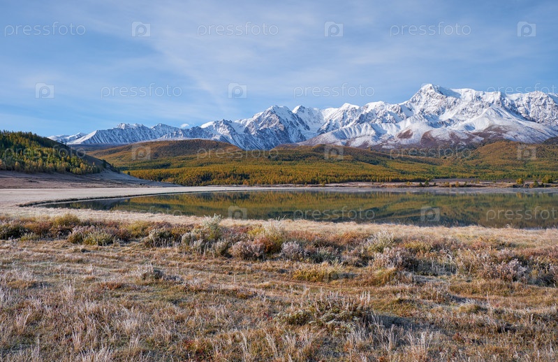 Алтайское озеро Джангыскол на горном плато Эштыкель. Трава покрыта инеем. Алтай, Сибирь, Россия