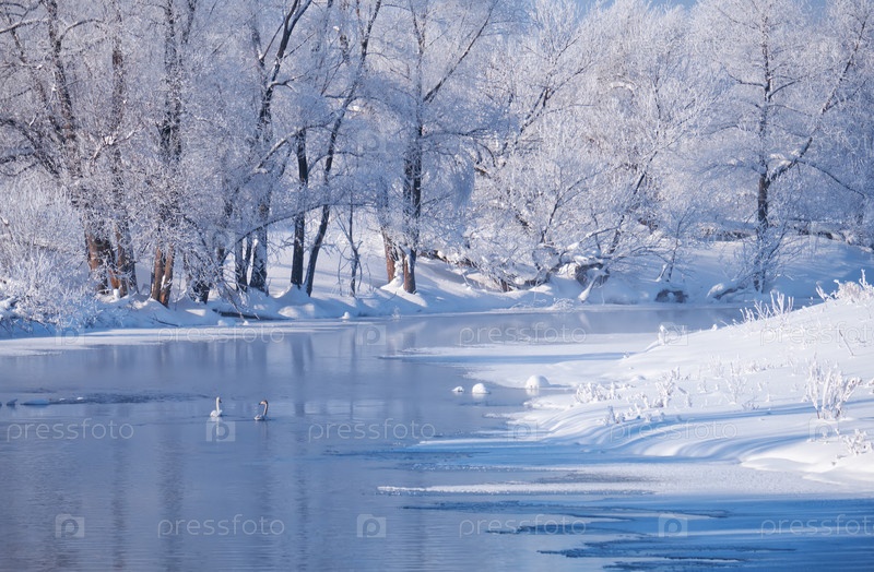 Алтайская река Талица с парой лебедей и отражением ив, покрытых инеем в воде зимой