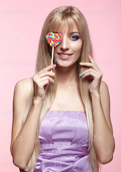 Портрет красоты молодой блондинки на розовом фоне. Женщина с леденцом на палочке в руках