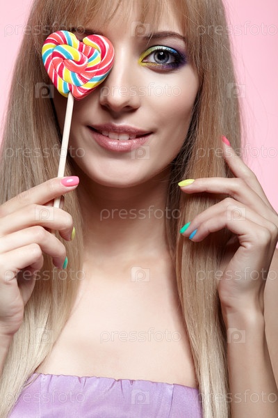 Портрет красоты молодой блондинки на розовом фоне. Женщина с леденцом на палочке в руках