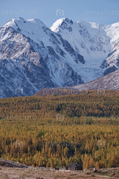 Дом пастуха аил и стадо коров на Алтайском горном плато Ештыкель. На заднем плане Северо-Чуйский хребет. Алтай, Россия
