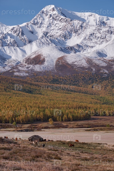 Дом пастуха аил и стадо коров на Алтайском горном плато Ештыкель. На заднем плане Северо-Чуйский хребет. Алтай, Россия
