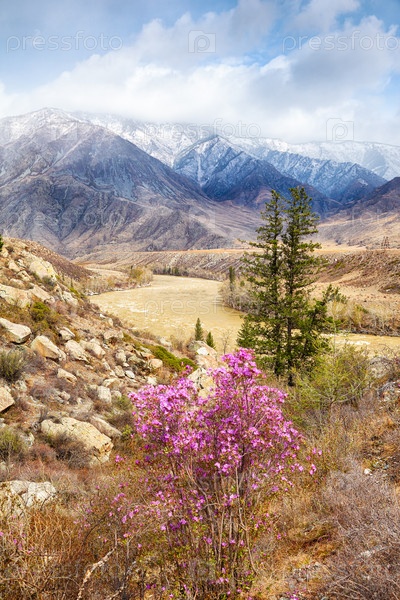 Алтайский пейзаж с цветами rhododendron dauricum