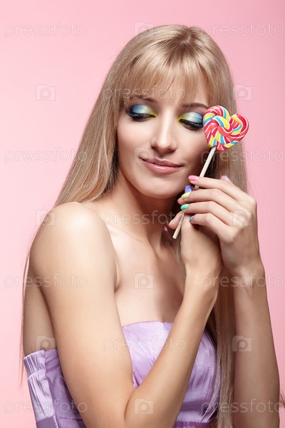 Портрет красоты молодой блондинки на розовом фоне. Женщина с леденцом на палочке в руках