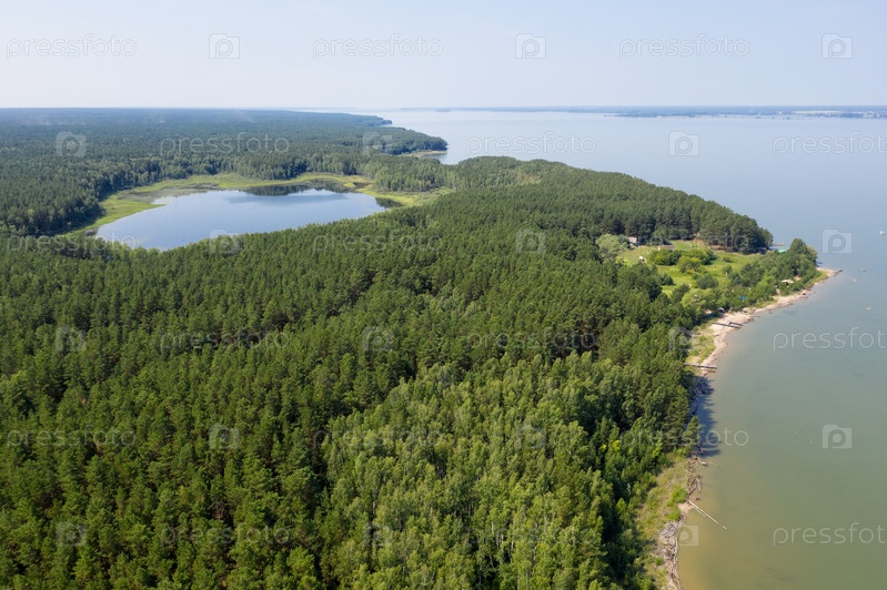 Аэрофотосъемка лесного заболоченного озера в Караканском бору у берега Обского водохранилища