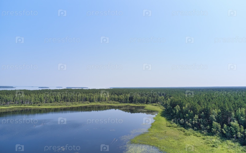 Аэрофотосъемка лесного заболоченного озера в Караканском бору у берега Обского водохранилища