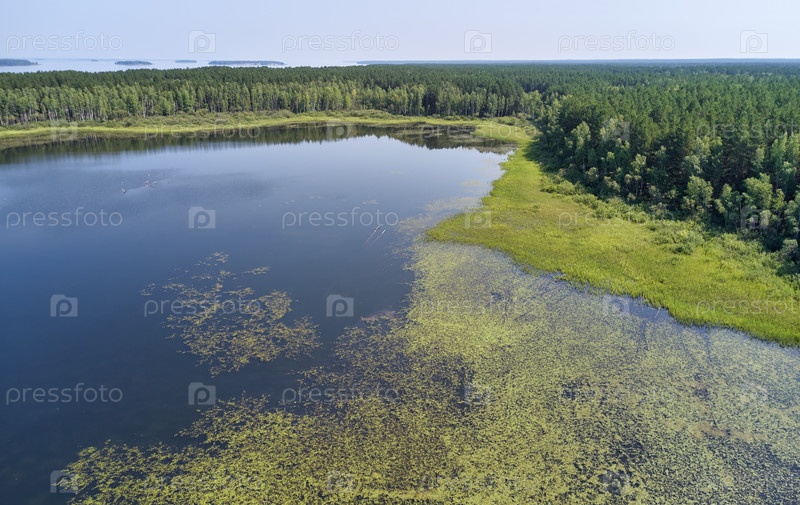 Аэрофотосъемка лесного заболоченного озера в Караканском бору у берега Обского водохранилища