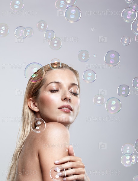 Красивая молодая блондинка с мыльными пузырями на сером фоне