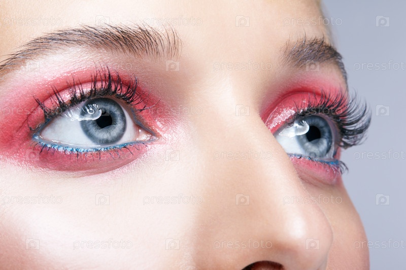 Крупным планом макросъемка женского лица и розового дымчатого макияжа глаз