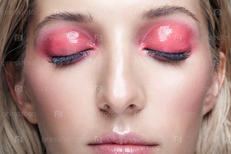 Крупным планом макросъемка женского лица и розового дымчатого макияжа глаз