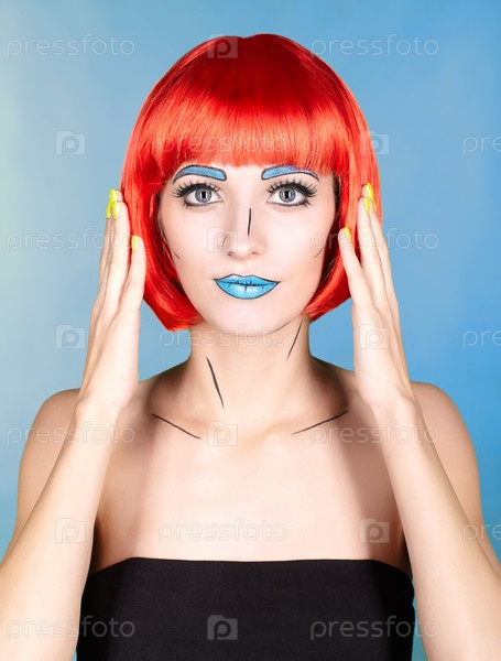 Женщина в рыжем парике и в стиле комического поп-арта на синем фоне