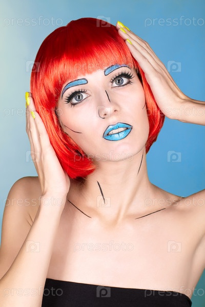 Женщина в рыжем парике и в стиле комического поп-арта на синем фоне