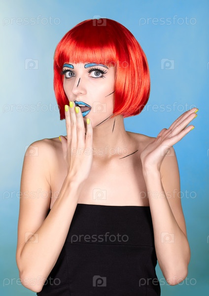 Женщина в рыжем парике и в стиле комического поп-арта на синем фоне