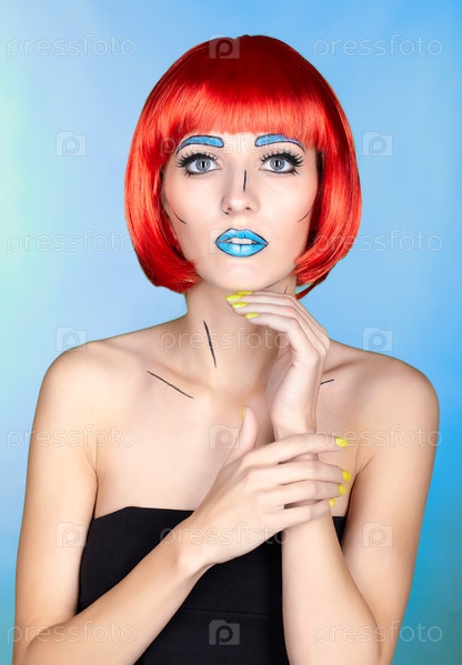 Женщина в рыжем парике и в стиле комического поп-арта на синем фоне