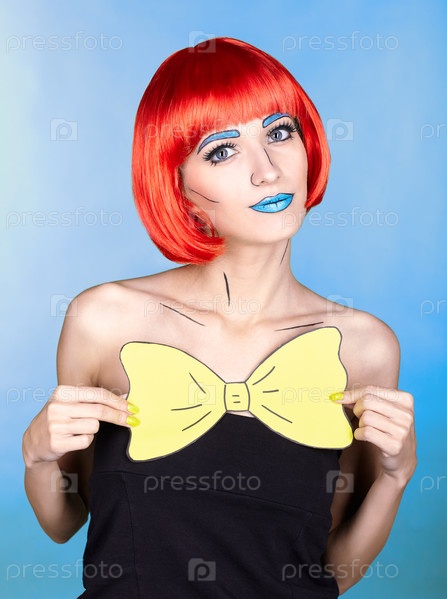 Женщина в рыжем парике и в стиле комического поп-арта на синем фоне