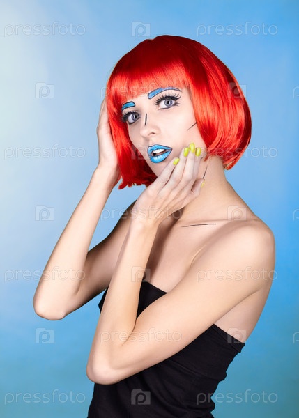 Женщина в рыжем парике и в стиле комического поп-арта на синем фоне