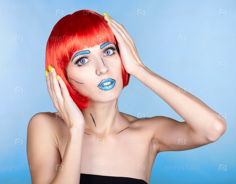 Женщина в рыжем парике и в стиле комического поп-арта на синем фоне