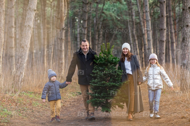 Веселая пара с детьми, несущая ель в лесу