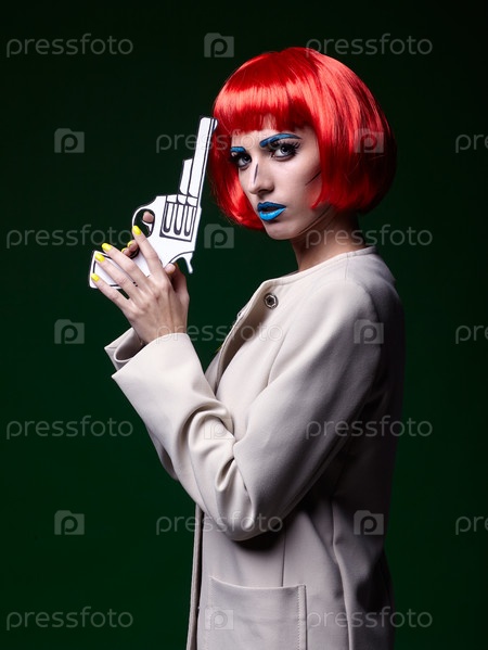 Портрет молодой женщины в стиле комического поп-арта. Женщина с пистолетом в руке