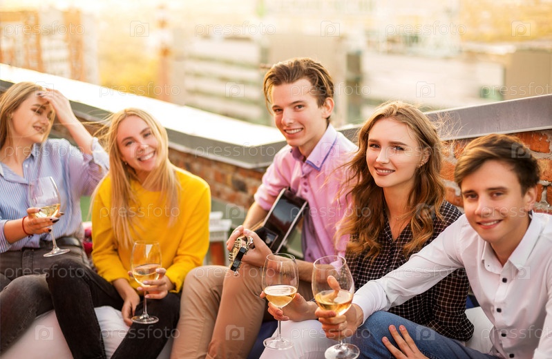 Веселые друзья пьют белое вино во время вечеринки на крыше
