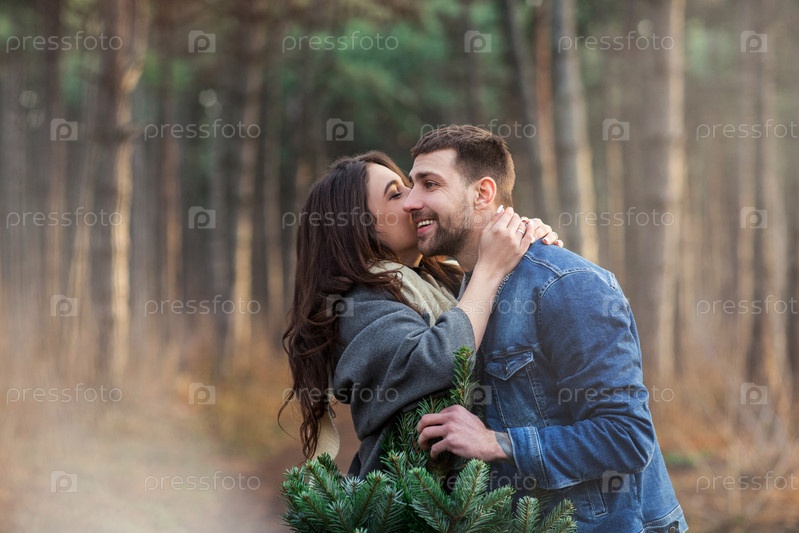 Веселая пара, несущая ель в лесу